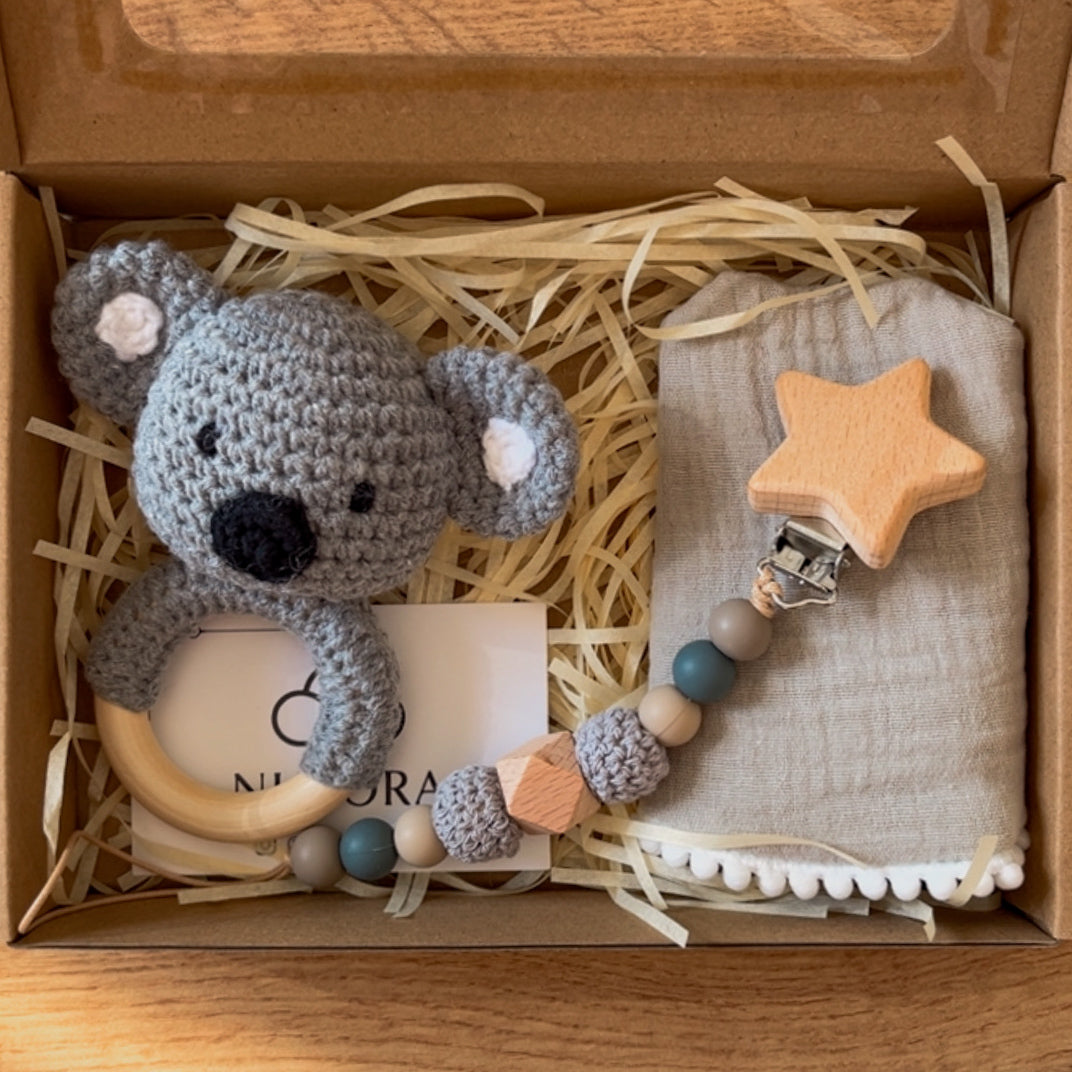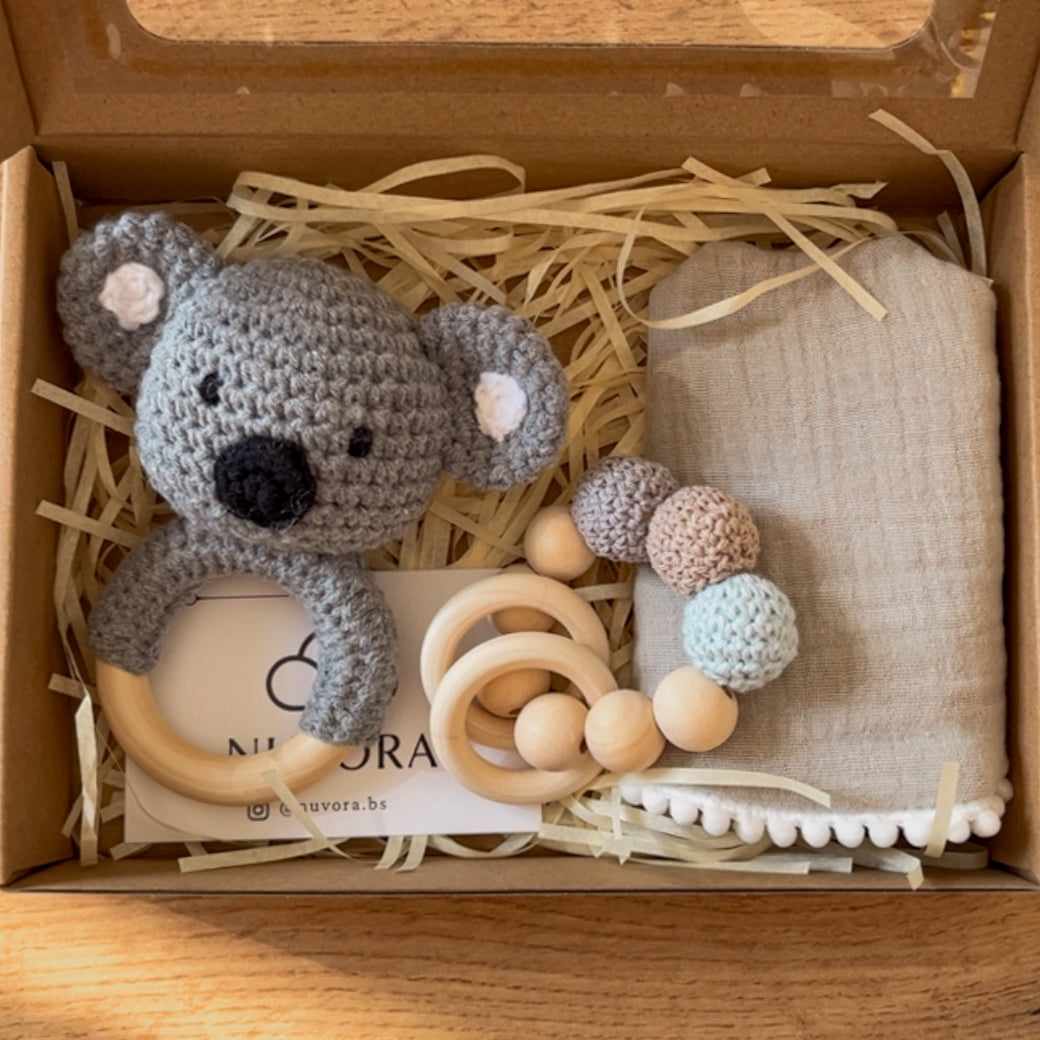 Cada canastilla está preparada con mimo e incluye una combinación equilibrada entre estimulación sensorial suave, utilidad diaria y estética cuidada. Es un formato mini, pero con un significado enorme.